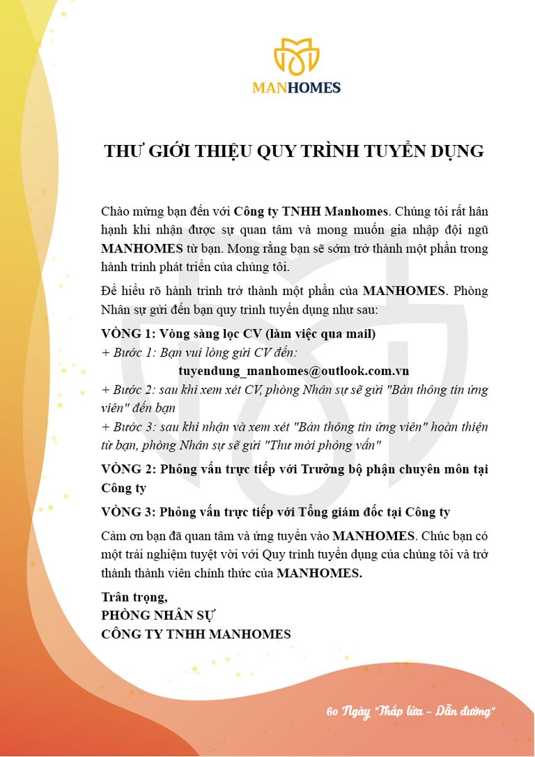 + Bước 1: Bạn vui lòng gửi CV đến tuyendung_manhomes@outlook.com.vn